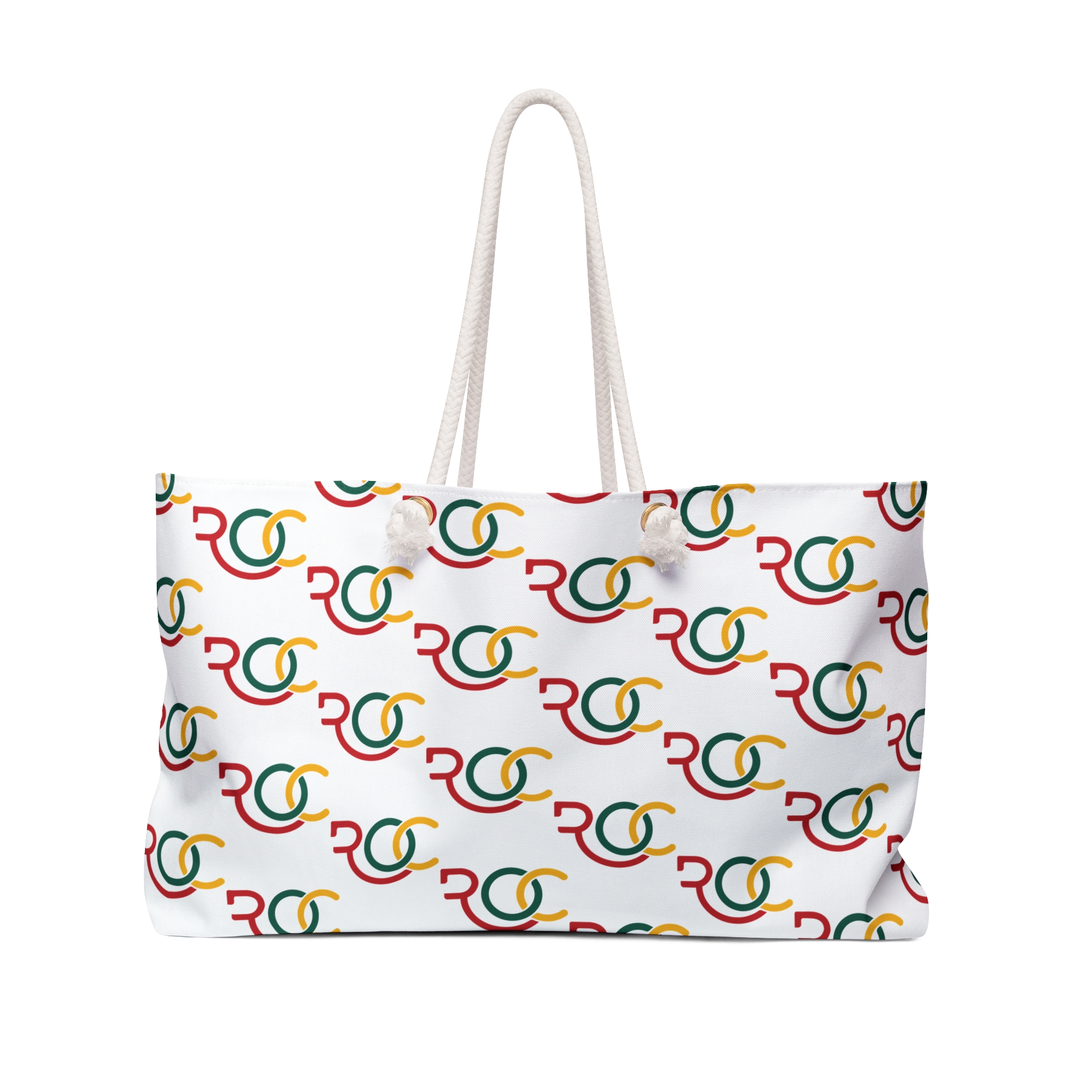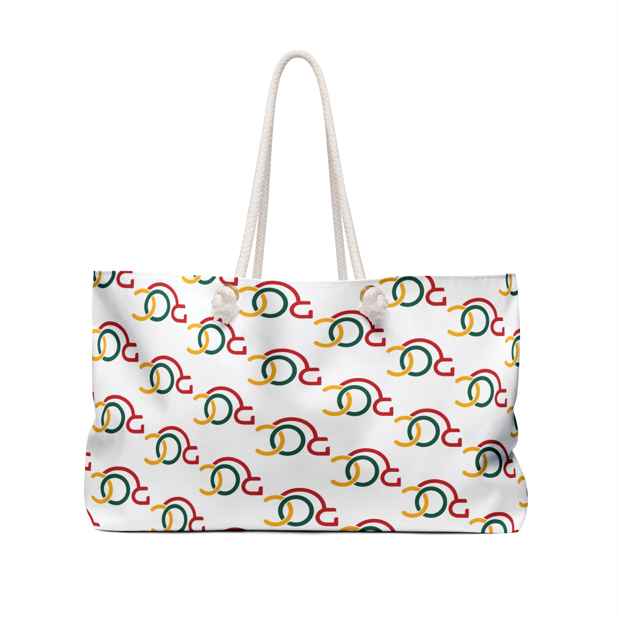Light, roomy, and cheerfully patterned — this weekender bag carries the easy confidence of a spontaneous escape. The soft spun-poly exterior resists wrinkles while the cream rope handles slip over the shoulder and anchor through gold-toned grommets for a nautical, relaxed feel. Inside, a cream cotton-blend lining and a structured T-bottom keep sunglasses, a paperback, and a change of clothes organized and ready. The repeating, colorful motif brings a playful, vintage-inspired energy that slips seamlessly from beach days to city breaks. Assembled in the USA from globally sourced parts, it’s built for short trips and everyday carry when you want something light, bold, and reliably fuss-free.